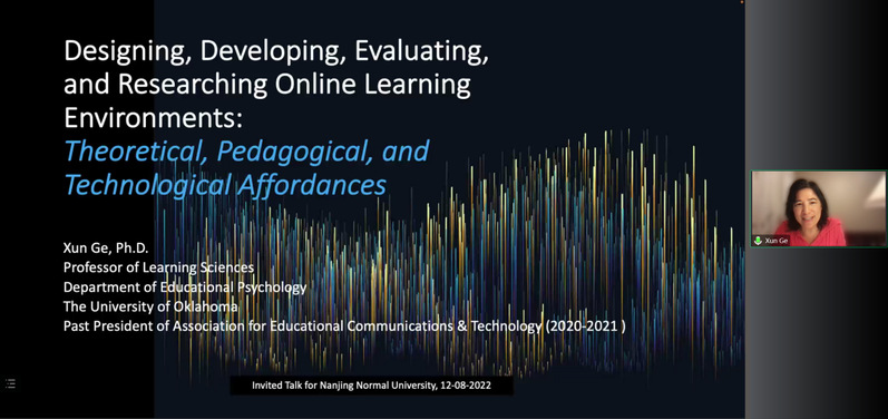 2022年12月8日晚,学院邀请AECT教育通信和技术协会前会长——美国俄克拉荷马大学葛迅教授在线作了题为“线上教学的设计、开发、评估和研究:学习理论、教学方法及学习技术的可供性”的报告,公司教师及博硕士研究生聆听了此次报告。