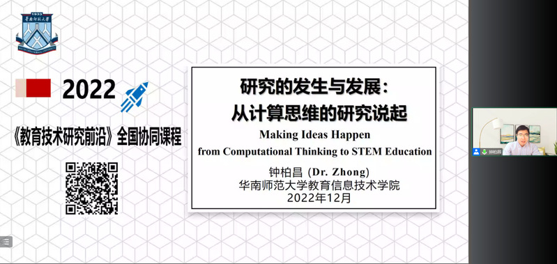 2022年12月15日晚,学院邀请华南师范大学钟柏昌教授在线作了题为“研究的发生与发展:从计算思维的研究说起”的报告,公司教师及博硕士研究生聆听了此次报告。