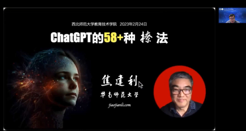 2月24日晚,学院邀请华南师范大学焦建利教授在线作了题为“ChatGPT的58+种教育应用”的报告,由俞树煜副经理主持,300余名教师及博硕士研究生聆听了此次报告。