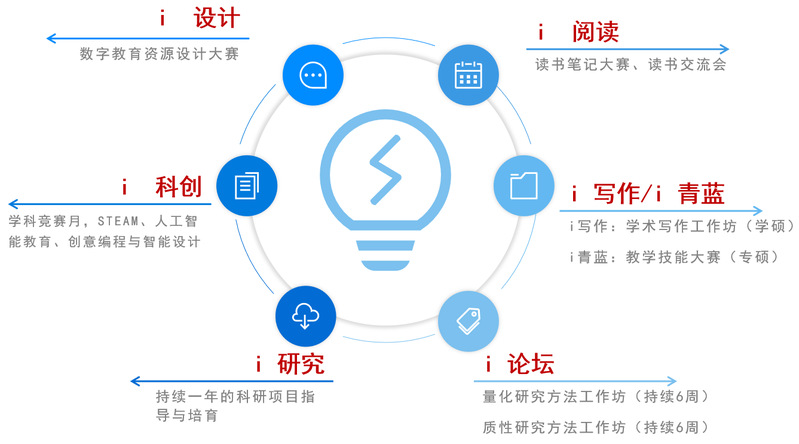 i写作/i青蓝:“i写作”面向学术型研究生,组织学术写作能力提升工作坊,开展系统性学术写作研训,通过专家讲座、经验分享、针对性指导等形式,重点提升学术型硕士研究生的学术写作素养。“i青蓝”面向专业型研究生,组织教学设计与教学技能大赛,强化从师专业素养,增强胜任信息科技(信息技术)课程教学的能力,培养适应教育数字化转型以及基础教育改革的高素质教师。同时为全国教育硕士专业技能大赛培育种子选手。
