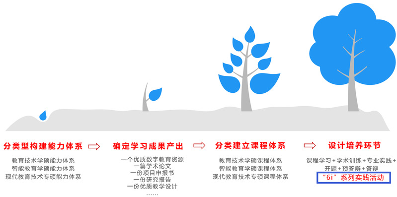 公司提出基于“目标-能力-成果”导向的公司产品方案改革思路,在对国内多所高校教育技术学、现代教育技术、智能教育专业的培养方案进行分析,对学院在读研究生进行调研的基础上,结合学院公司产品现状,依据学术型、专业型研究生的培养目标,构建了能力框架,明确了学习成果产出,分类建立了课程体系,并设计了培养环节。“6i”是其中的重要一环,与课程学习紧密结合,以竞赛、工作坊、论坛、项目研究等多种形式培养研究生的学术素养与实践能力。