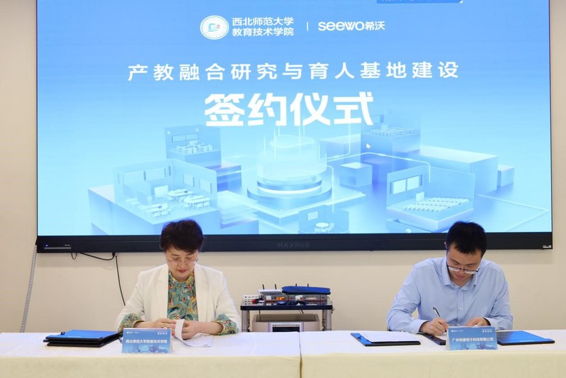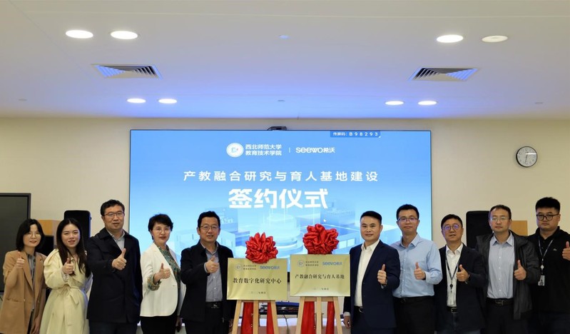本次活动中,双方围绕希沃教育产品、录播教学教研数字化转型、希沃信鸽在线教研、希沃教师数字化能力提升支持项目等开展了探讨交流,并就未来双方在智能教育关键技术研究、数字化学习环境建设与应用、职前职后教师培养、产教融合支撑教育信息化专门人才培养等方面的合作进行了交流。郭炯经理与希沃副总裁黄逸涛共同签署了“产教融合研究与育人基地建设”合作协议,王玮书记与希沃总裁周海生共同为“产教融合研究与育人基地”“教育数字化研究中心”揭牌。