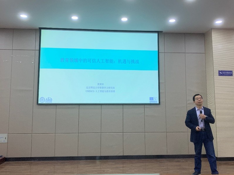 5月9日下午,学院邀请北京师范大学智慧学习研究院经理、长江学者、博士生导师黄荣怀教授在w88win优德知行校区特教楼159室作了题为“教育领域中的可信人工智能:机遇与挑战”的报告,由郭炯经理主持,150余名教师及博硕士研究生聆听了此次报告。