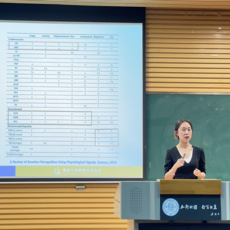 首先,郭老师以人工智能的三个阶段为切入点,引出“情感智能”这一未来发展方向。之后,郭老师以通俗易懂的语言详细介绍了情感智能与情感计算,包括研究目的、阶段、应用、研究内容等多个方面。紧接着,郭老师围绕情感计算中的情感识别展开报告,展示大量图表,生动地向大家讲解了面部情感识别、语音情感识别、生理信号情感识别及多模态融合情感识别。随后,郭老师指出情感计算在教育领域中的应用主要涉及在线教育、人机协同支持的双师教学、特殊儿童教育和教学评价四个方面,并对具体应用进行了举例介绍。接下来,郭老师分享了团队目前的研究工作——抑郁症识别,包括融合2D和3D面部表情的抑郁症识别、融合注意力机制对长时面部表情编码的抑郁症识别等四个主要内容,并提出团队进一步的研究工作是“基于人机共情对话的老员工个性化心理干预研究”。最后,郭老师和同学们探讨了情感计算面临的机遇和挑战。