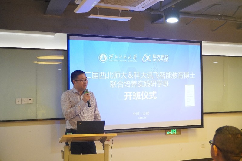 6月12日,“第二届西北师大与科大讯飞智能教育博士联合培养实践研学班”在合肥科大讯飞语音产业基地正式开班。科大讯飞股份有限公司教育事业群副总裁郭超,w优德88中文版副经理俞树煜教授,讯飞教育技术研究院经理、博士生导师刘邦奇教授,讯飞教育技术研究院首席技术专家王亚飞副教授,讯飞教育技术研究院高级专家陈乐副教授,讯飞教育技术研究院产品业务研究部主任刘俊生,讯飞教育技术研究院产学研合作部主任张金霞,讯飞教育技术研究院助教团队及w88win优德7名智能教育、教育信息化治理博士研究生参与了本次活动。