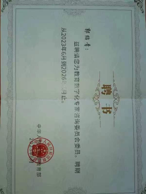 会议宣布成立“教育部教育数字化专家咨询委员会总体组”,教育部党组书记、部长怀进鹏为专家组成员颁发聘书,公司郭绍青教授被聘为教育部教育数字化专家咨询委员会总体组委员,接受怀进鹏部长颁发的聘书。