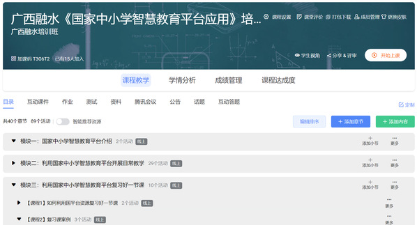 融水县教育局副局长李荣生指出融水存在着城乡教育差距、优质教师不足等瓶颈,感谢科技司、西北基地对融水教育的帮扶支持。希望教师能够通过课程学习不断提升信息技术应用能力,充分应用国家中小学智慧教育平台资源提升自身的公司产品质量。