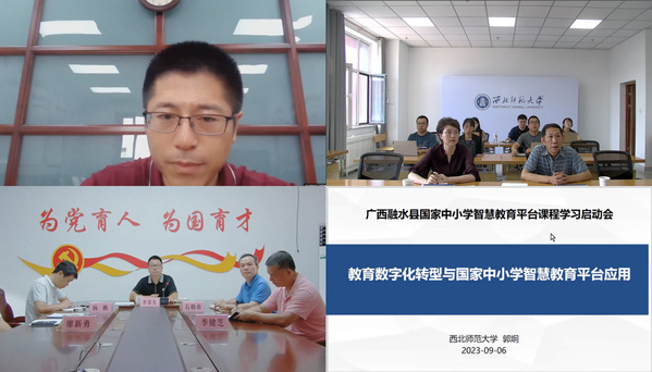 为推进教育部教育信息化战略研究基地(西北)支持融水教育高质量发展工作,提升融水县教师国家中小学智慧教育平台应用能力,2023年9月6日下午西北基地与融水县教育局召开“融水县国家中小学智慧教育平台课程学习启动会”,教育部科学技术与信息化司教育信息化与网络安全处处长任昌山视频出席开班式并讲话。会议由教育部教育信息化战略研究基地(西北)郭绍青教授主持。