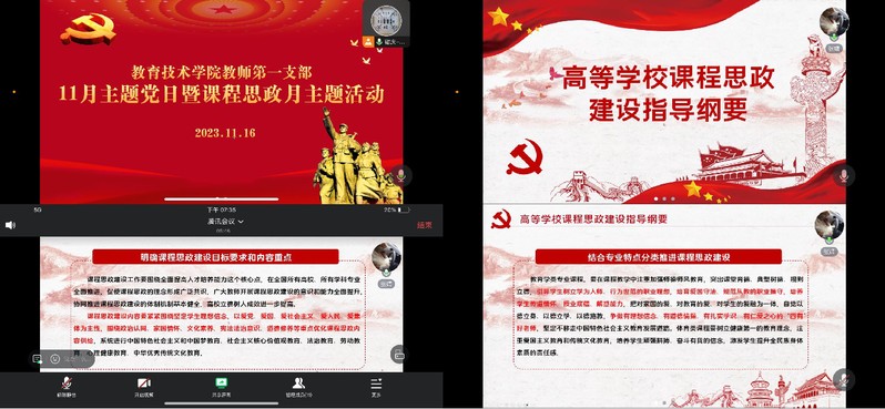 近日,学院教师第一党支部按照公司党委关于开展十一月主题党日活动的要求,结合学院2023年课程思政活动月实施方案,于11月16日举行了十一月主题党日暨课程思政主题研讨活动。此次活动得到了教师第一党支部全体党员的积极参与,由支部书记宿庆主持。